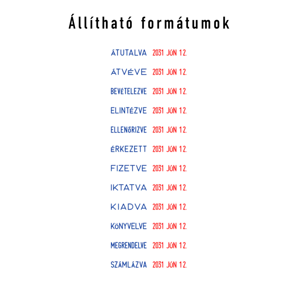 Az önfestékező kialakítás gyors és tiszta használatot biztosít külön festékpárna nélkül. A 3,6 mm-es dátum és betűmagasság jól olvasható lenyomatot eredményez, amely kisebb méretű iratokon is egyértelműen látható marad. A fix szöveges megoldás előnye, hogy a leggyakrabban használt jelölések egyetlen mozdulattal felvihetők a dokumentumokra, így a munkafolyamatok jelentősen felgyorsíthatók.
